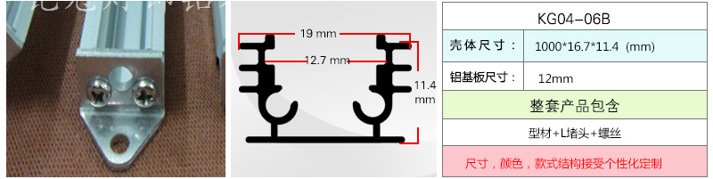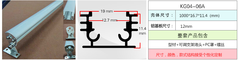 KG04-06有A、B、C三款,A款配可调角度支架堵头,B款配L型铝堵头,C款配铝片堵头,3款都包含铝槽,PC罩,堵头,卡扣;库存材料3米,尺寸可定制,可拼接超长制作,厂家自营,A、B、C款都时尚百搭,满足您的挑剔,灯槽采用环保国标铝6063-T5作主材料,耐磨性良抗腐蚀,抗氧化等性能优良。采用激光切割机,切口处光滑平整,施工时可完美对接,无论家装还是商用,都能轻松搞定。