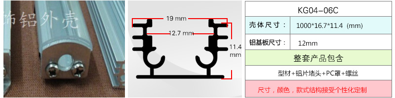 | 型材1支 + 铝片堵头(L型堵头)2个 + PC罩 + 螺丝1套 | ||